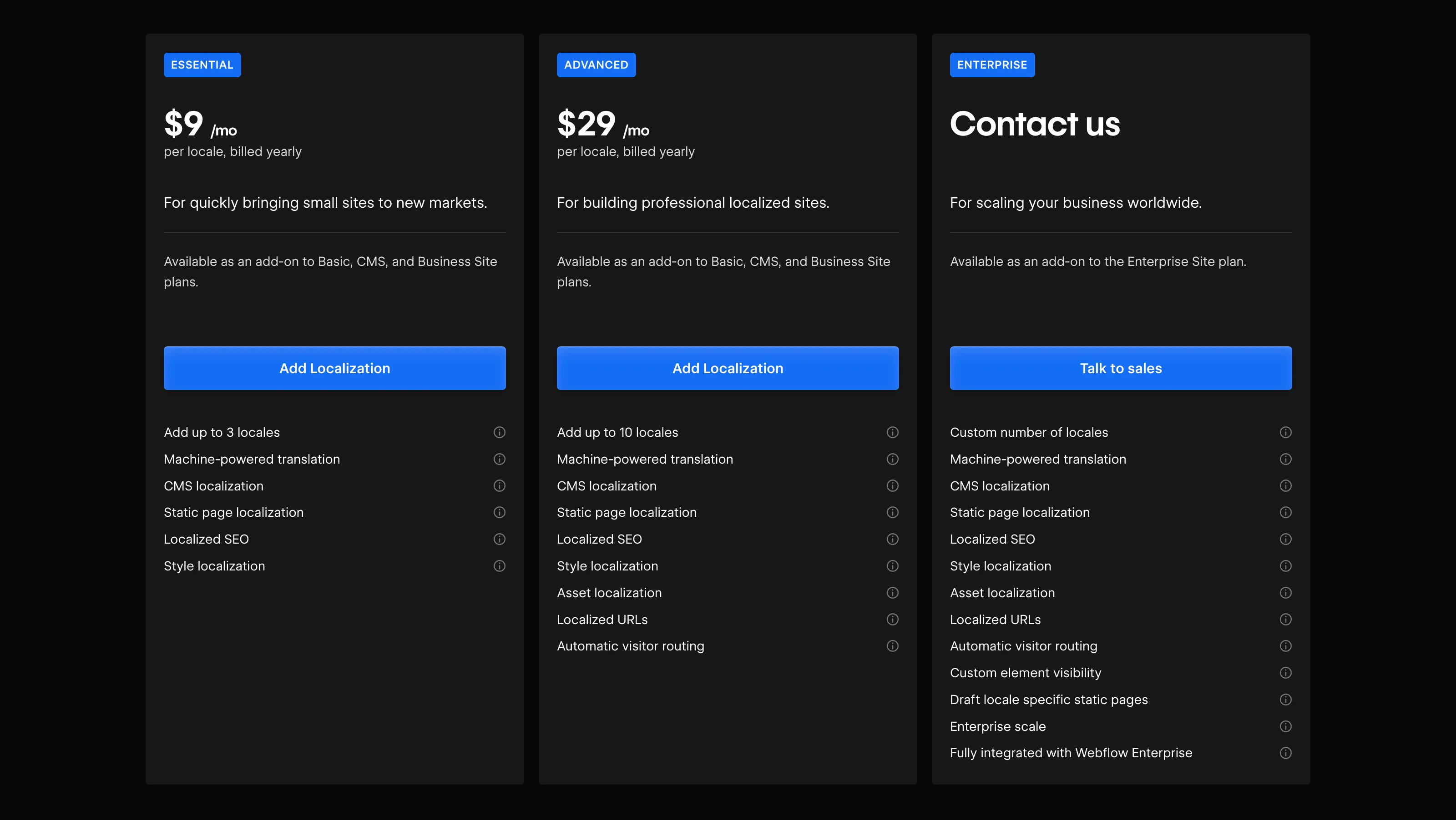 C’est la solution la plus propre si tu veux créer un site international sans empiler des plugins externes : tu gardes un responsive design identique et un back-office intuitif pour l’équipe contenu. L’add-on se facture par site, en plus du Site Plan, avec des paliers qui varient selon le nombre de langues et de ressources (pages/Items CMS). Idéal pour une refonte multilingue structurée ou pour étendre votre site internet actuel vers de nouveaux marchés.
