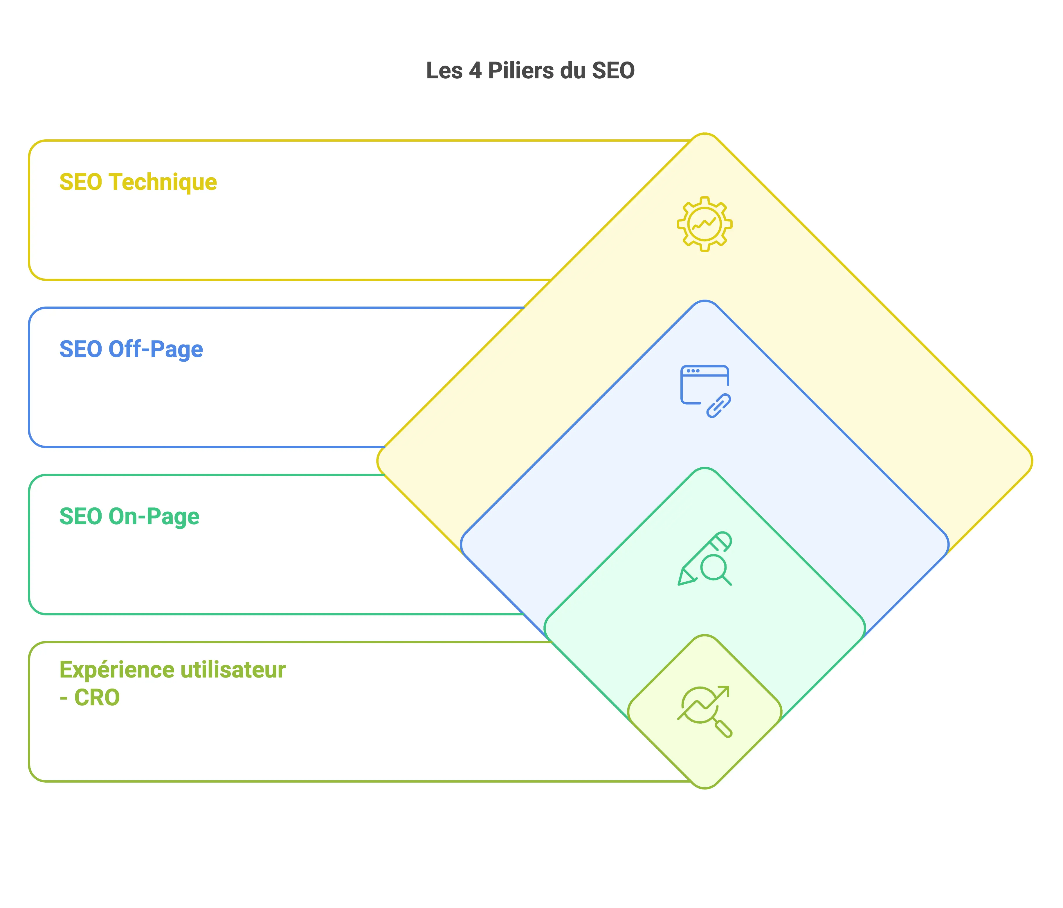 On-page SEO : This is the optimization of the internal elements of the website. This includes the quality and organization of content, the appropriate use of keywords, the appropriate use of keywords, the formatting of titles (H1, H2, etc.), the optimization of metadata (such as title tags and meta descriptions), and the use of ALT attributes for images. It's also about making sure the site has a logical URL structure and is easy to navigate.