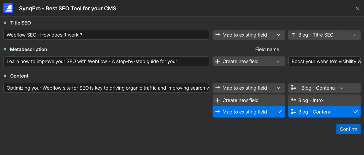 SynqPro s’adapte à la structure existante de votre CMS et vous crée automatiquement les champs supplémentaires nécessaires pour faire toutes les optimisations SEO.